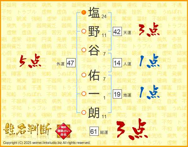 塩(24画)野(11画)谷(7画) 佑(7画)一(1画)朗(11画)