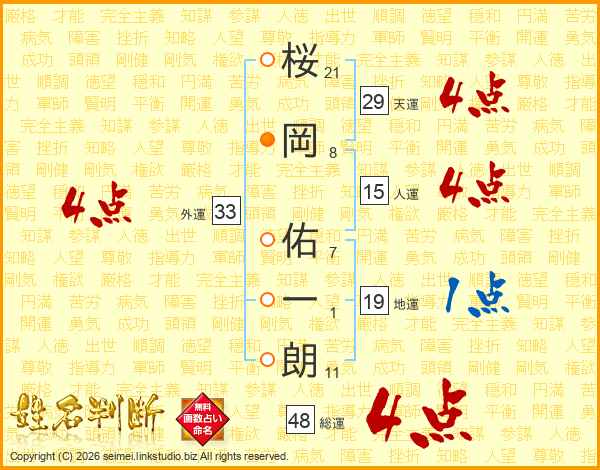 桜(21画)岡(8画) 佑(7画)一(1画)朗(11画)