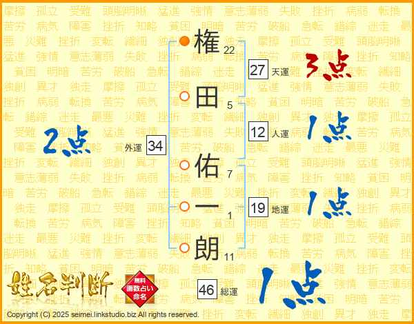 権(22画)田(5画) 佑(7画)一(1画)朗(11画)