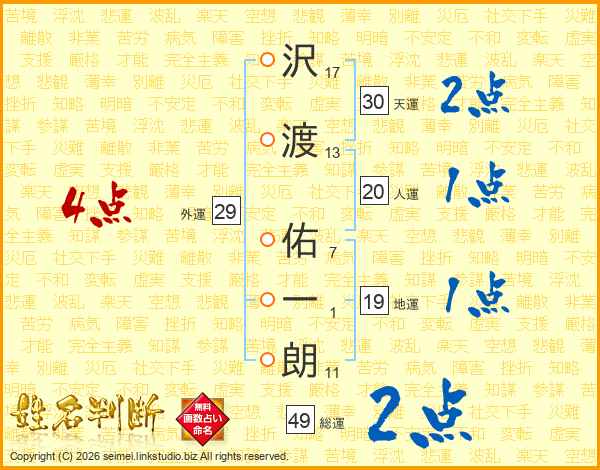 沢(17画)渡(13画) 佑(7画)一(1画)朗(11画)