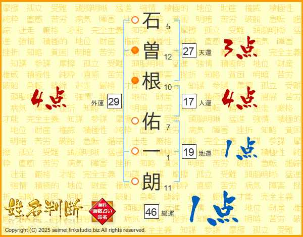 石(5画)曽(12画)根(10画) 佑(7画)一(1画)朗(11画)