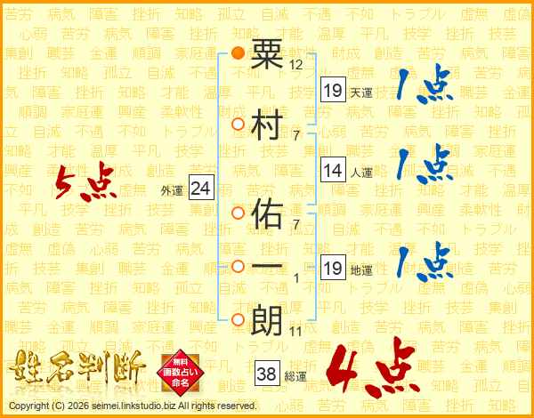 粟(12画)村(7画) 佑(7画)一(1画)朗(11画)