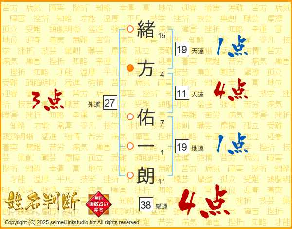 緒(15画)方(4画) 佑(7画)一(1画)朗(11画)