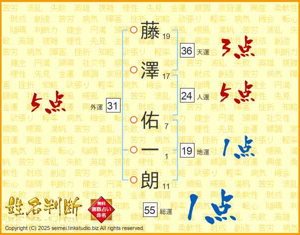 藤(19画)澤(17画) 佑(7画)一(1画)朗(11画)