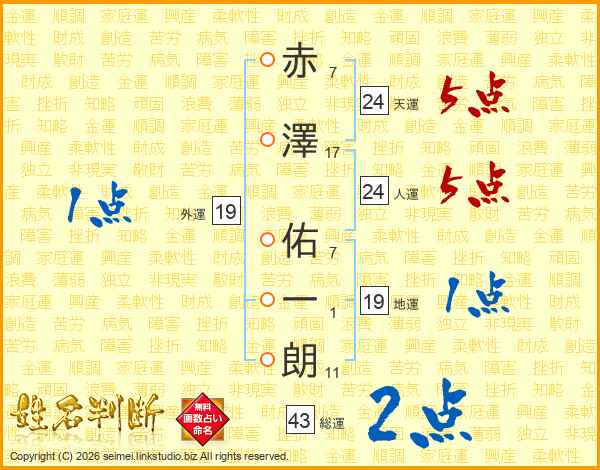 赤澤佑一朗さんの天運は24画の5点!