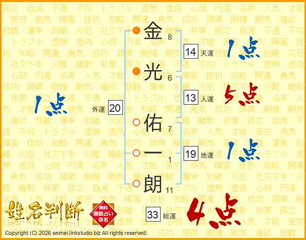 金(8画)光(6画) 佑(7画)一(1画)朗(11画)