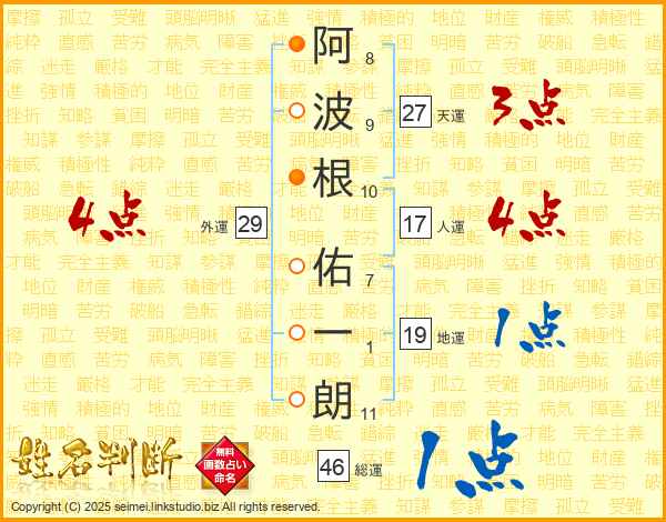 阿(8画)波(9画)根(10画) 佑(7画)一(1画)朗(11画)