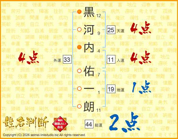 黒(12画)河(9画)内(4画) 佑(7画)一(1画)朗(11画)