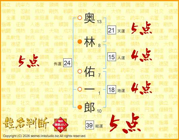 奥(13画)林(8画) 佑(7画)一(1画)郎(10画)