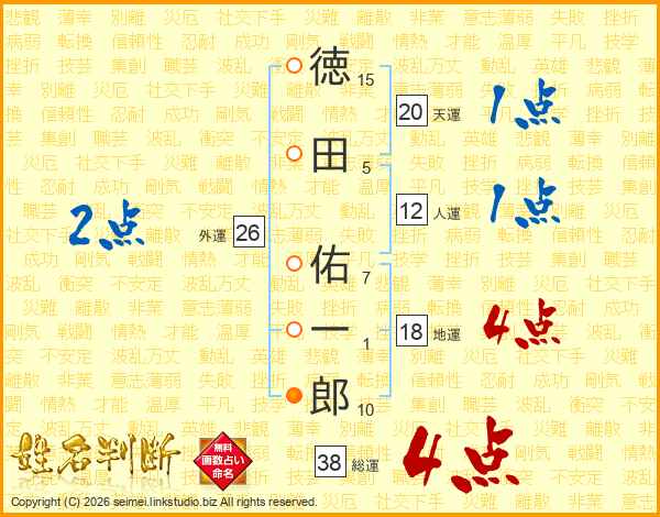 徳(15画)田(5画) 佑(7画)一(1画)郎(10画)