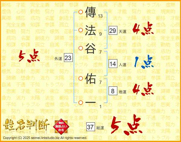 生活面を象徴する運勢です。外部から受ける影響力を表し、結婚運、家庭運や職場、環境への順応性を表します。総運から人運を引いた画数。姓や名が1文字の場合を除く。