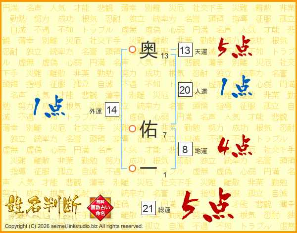 奥佑一さんの総運は21画の5点!