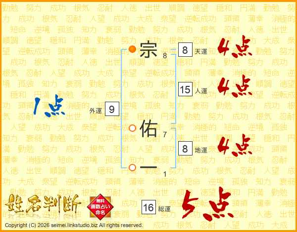 宗佑一さんの総運は16画の5点!