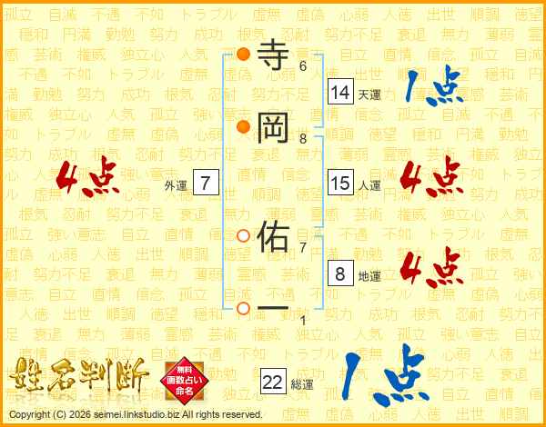 寺(6画)岡(8画) 佑(7画)一(1画)