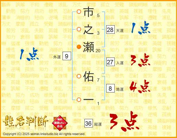 市(5画)之(3画)瀬(20画) 佑(7画)一(1画)