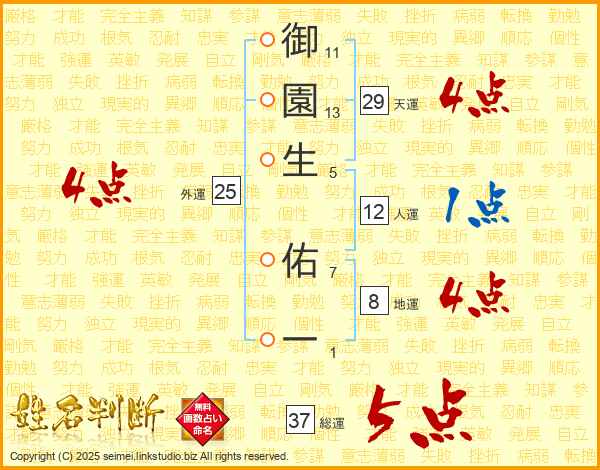 御(11画)園(13画)生(5画) 佑(7画)一(1画)