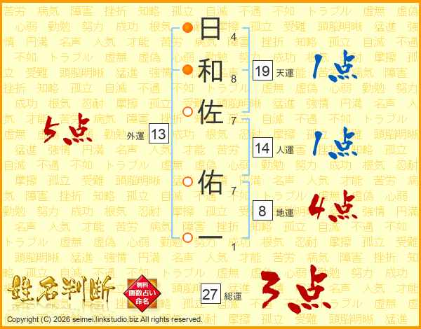 日(4画)和(8画)佐(7画) 佑(7画)一(1画)