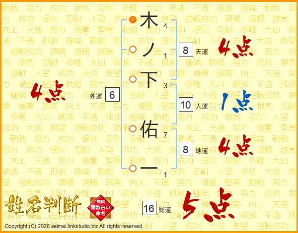 木ノ下佑一さんの総運は16画の5点!