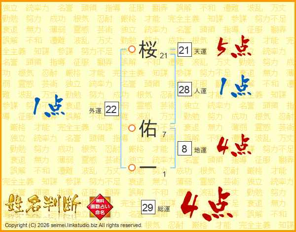 生活面を象徴する運勢です。外部から受ける影響力を表し、結婚運、家庭運や職場、環境への順応性を表します。総運から人運を引いた画数。姓や名が1文字の場合を除く。