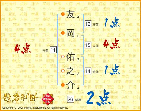 友(4画)岡(8画) 佑(7画)之(3画)介(4画)