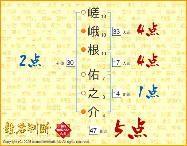 嵯(13画)峨(10画)根(10画) 佑(7画)之(3画)介(4画)