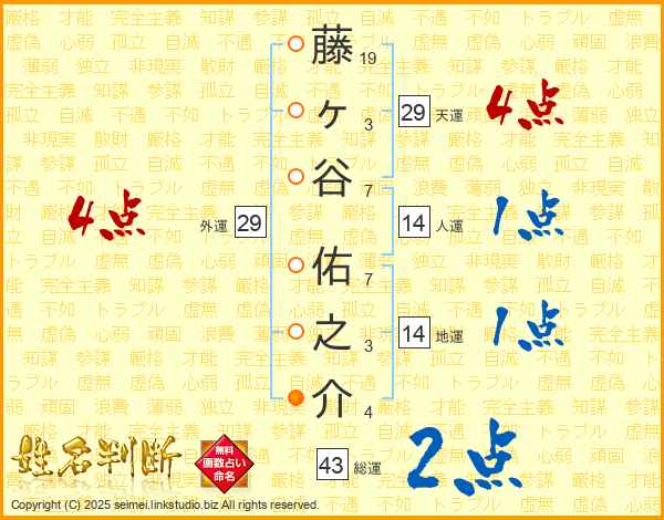 藤(19画)ヶ(3画)谷(7画) 佑(7画)之(3画)介(4画)