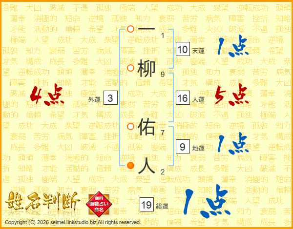 生活面を象徴する運勢です。外部から受ける影響力を表し、結婚運、家庭運や職場、環境への順応性を表します。総運から人運を引いた画数。姓や名が1文字の場合を除く。