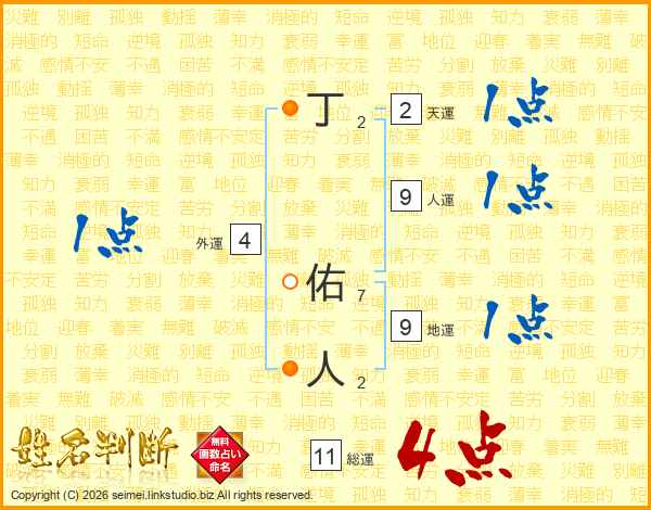 生活面を象徴する運勢です。外部から受ける影響力を表し、結婚運、家庭運や職場、環境への順応性を表します。総運から人運を引いた画数。姓や名が1文字の場合を除く。