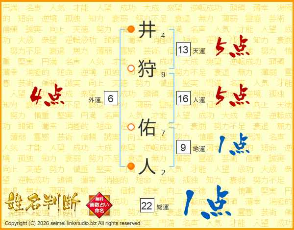 生活面を象徴する運勢です。外部から受ける影響力を表し、結婚運、家庭運や職場、環境への順応性を表します。総運から人運を引いた画数。姓や名が1文字の場合を除く。