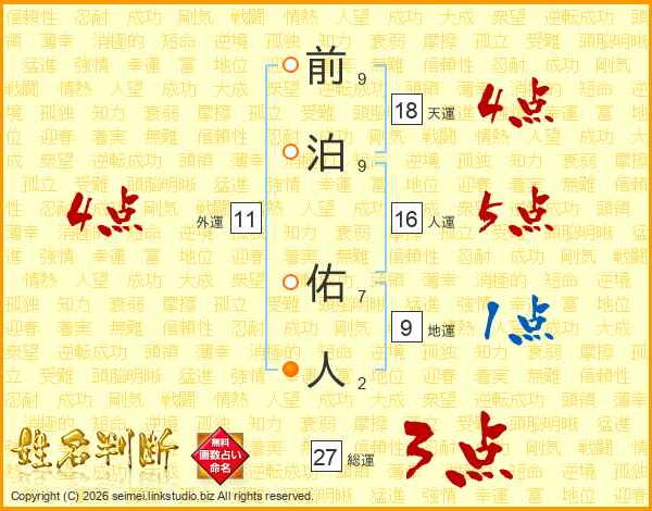 あなたの人生を表す1番重要な運勢です。生涯を通じて影響する総合運となり、主に50歳以降の晩年期に影響を及ぼします。苗字と名前の合計画数。