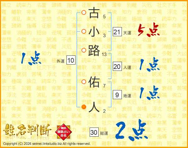 古(5画)小(3画)路(13画) 佑(7画)人(2画)
