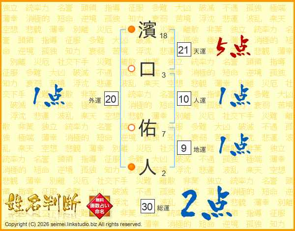 画数の奇数(○陽)と偶数(●陰)の配列で吉凶を占います。どちらかにかたよる名前は大凶名で避ける必要があります。画数の奇数偶数。