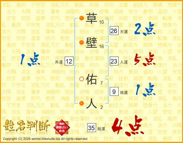 生活面を象徴する運勢です。外部から受ける影響力を表し、結婚運、家庭運や職場、環境への順応性を表します。総運から人運を引いた画数。姓や名が1文字の場合を除く。
