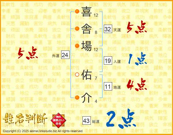 喜(12画)舎(8画)場(12画) 佑(7画)介(4画)