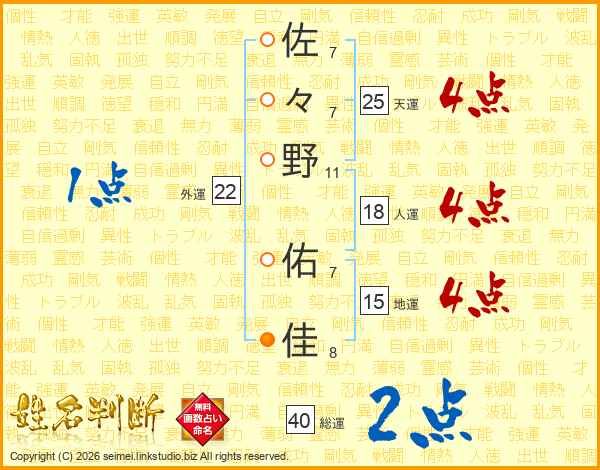 佐(7画)々(7画)野(11画) 佑(7画)佳(8画)