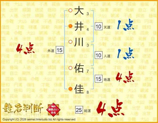 大(3画)井(4画)川(3画) 佑(7画)佳(8画)