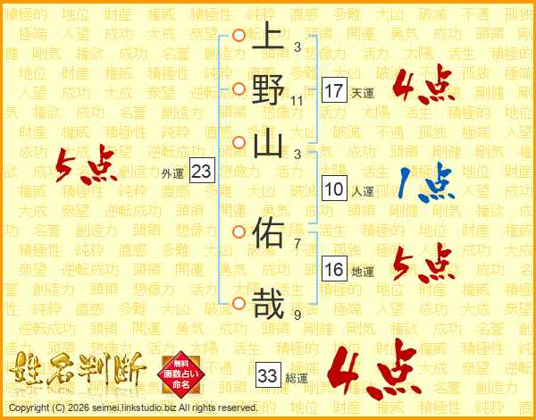 上野山佑哉さんの総運は33画の4点!