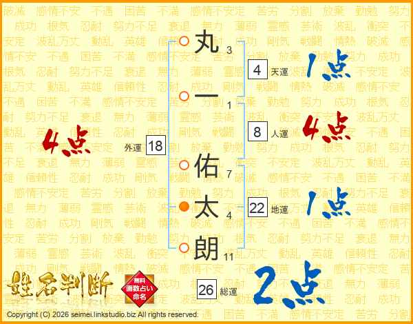 丸(3画)一(1画) 佑(7画)太(4画)朗(11画)