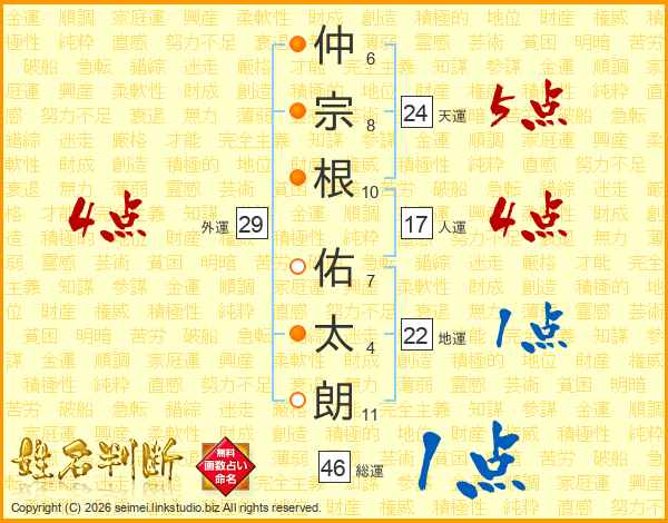 仲(6画)宗(8画)根(10画) 佑(7画)太(4画)朗(11画)