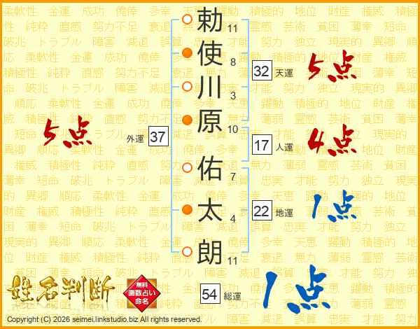 勅(11画)使(8画)川(3画)原(10画) 佑(7画)太(4画)朗(11画)