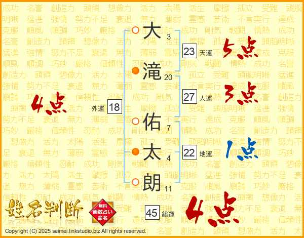 大(3画)滝(20画) 佑(7画)太(4画)朗(11画)