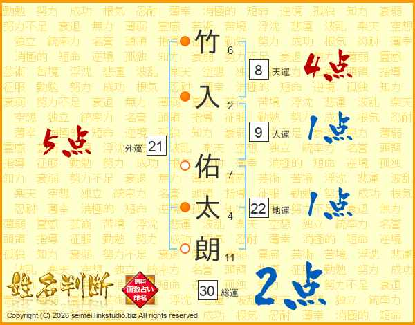 竹(6画)入(2画) 佑(7画)太(4画)朗(11画)