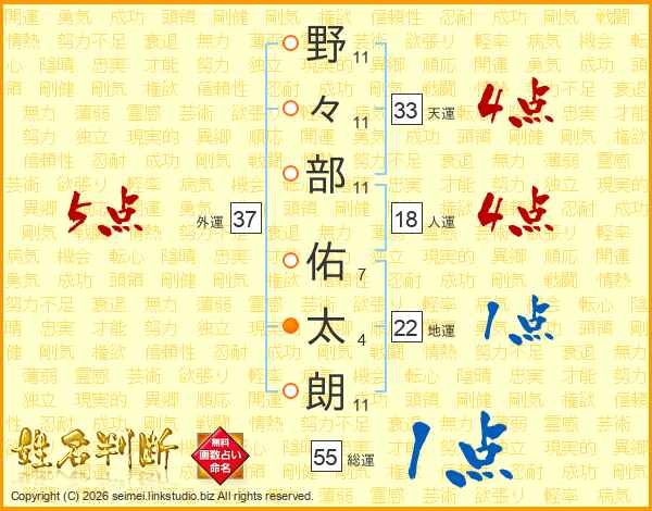 野(11画)々(11画)部(11画) 佑(7画)太(4画)朗(11画)