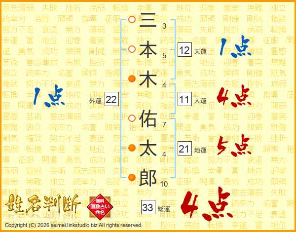 三(3画)本(5画)木(4画) 佑(7画)太(4画)郎(10画)