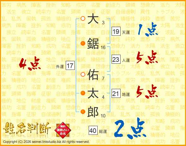 大(3画)鋸(16画) 佑(7画)太(4画)郎(10画)