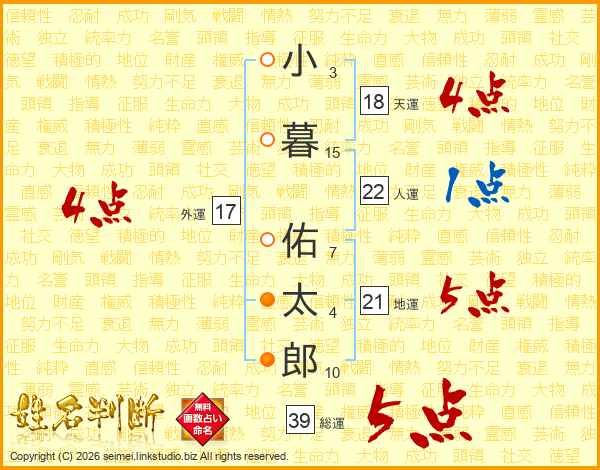 小(3画)暮(15画) 佑(7画)太(4画)郎(10画)