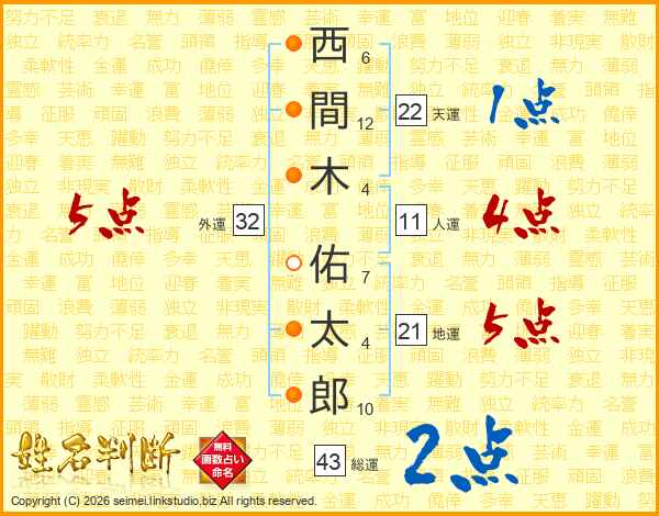 西(6画)間(12画)木(4画) 佑(7画)太(4画)郎(10画)