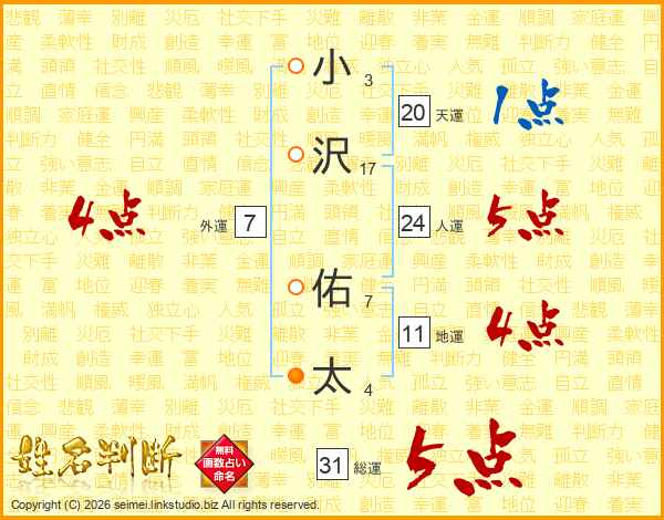 小沢佑太さんの総運は31画の5点!