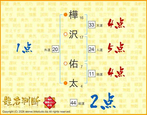 樺沢佑太さんの天運は33画の4点!