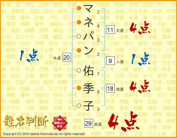 マ(2画)ネ(4画)パ(3画)ン(2画) 佑(7画)季(8画)子(3画)